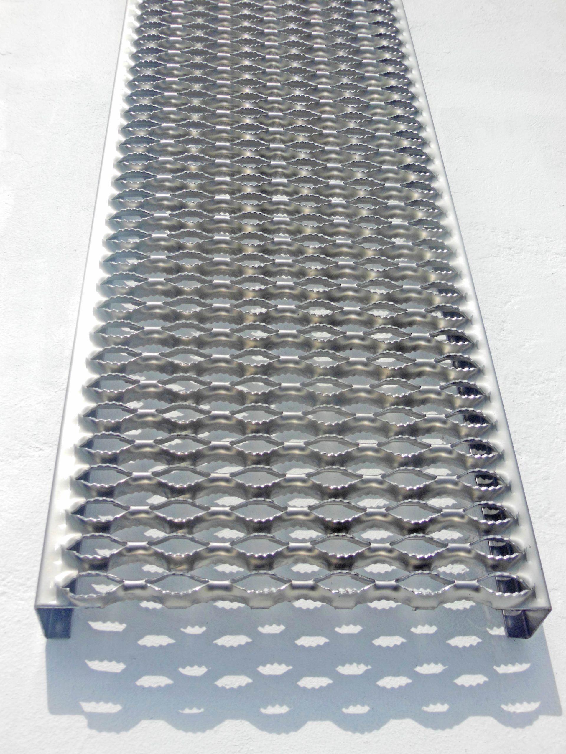 Pasarela de chapa antideslizante apta para pisos y entrepisos metálicos expuestos al derrame de líquidos. El sistema dentado del modelo SHARK proporciona un rápido drenaje de éstos, y sus propiedades antideslizantes garantizan una superficie segura de tránsito ante fluidos de consistencia resbaladiza.